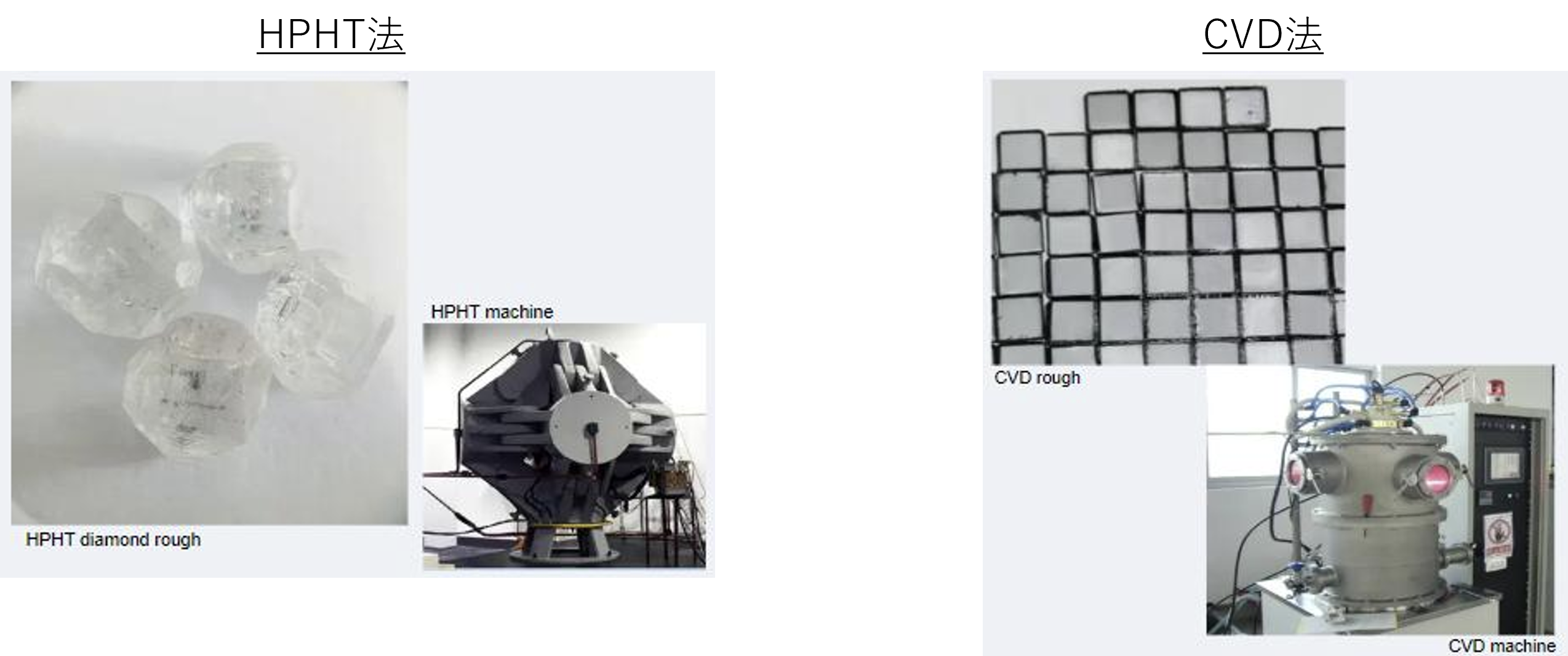 製造プロセスは、高圧高温(HPHT)法と化学気相蒸着法(CVD)法とを所有しております。サイズ、用途などに応じて優位性のある工法を選択しております。なお製造は中国のパートナー企業となります。