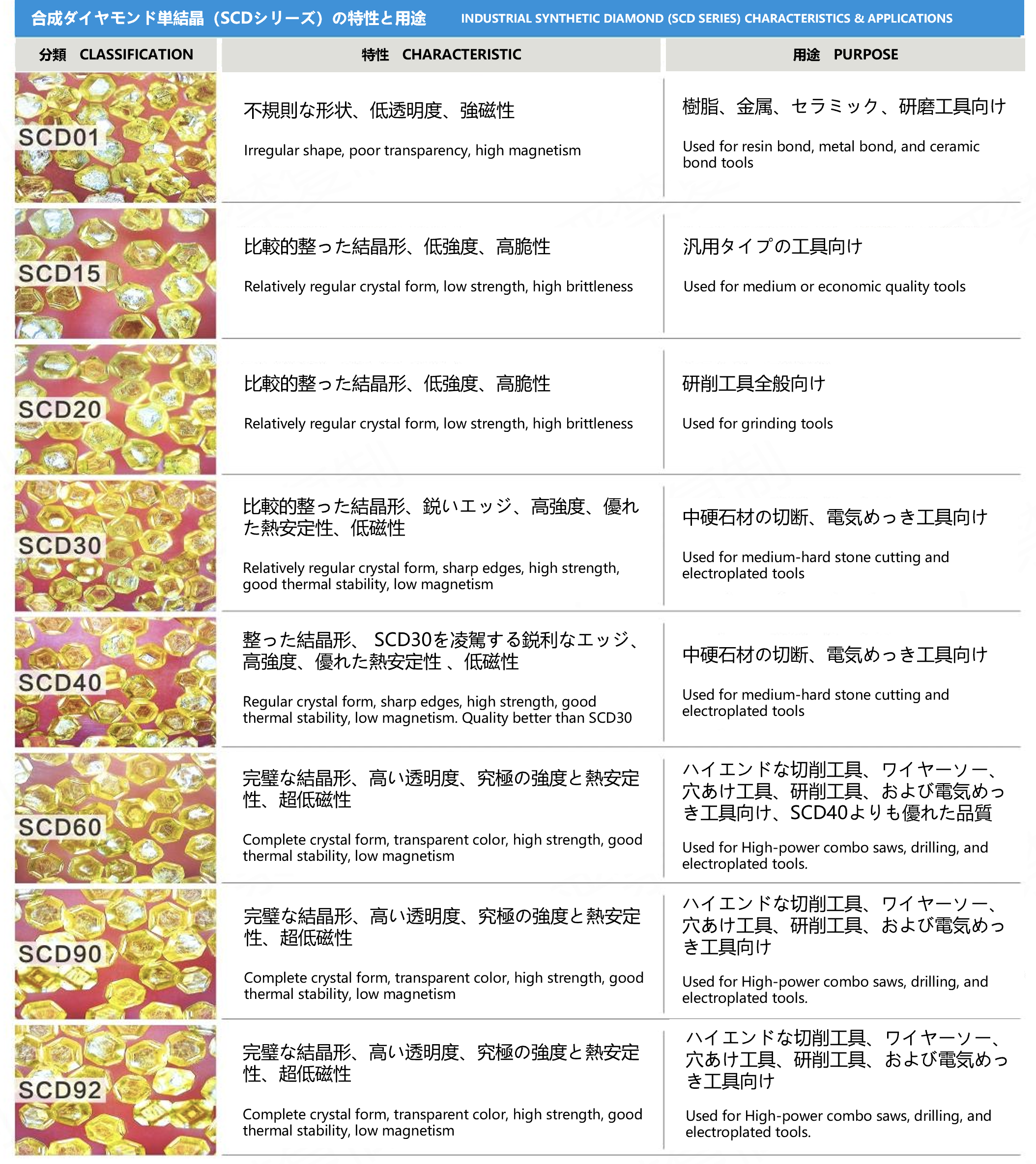 切削、研削、穴あけ、光学、エレクトロニクスといった産業用途向けとしまして、おもに単結晶ダイヤモンド(Single-Crystal Diamond)の粉末をお取り扱いしております。