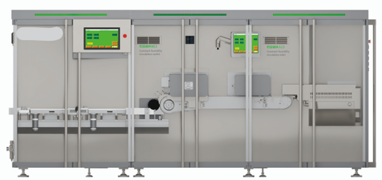 排出口には外観検査機能が備えられており、印刷品質を確認検出できます。印刷と検査が完了したアンプルは、プラスチックトレイ充填機に搬送され、ロボットアームが指定数量のアンプルをつかみ、例えば100個を中型サイズのプラスチックトレイに詰め込みます。