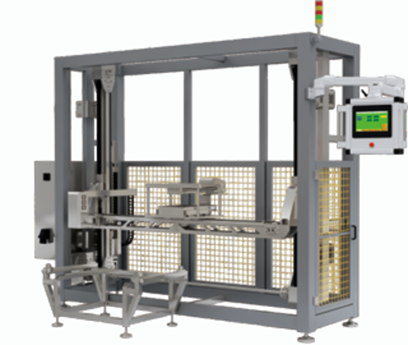 トレー取出し機は、サーボシステムによる取出し用機械式アームの制御により、滅菌カートの階層間の高さを正確に位置決めした後、トレーを階層ごとに搬送工程へ押し出し、上下移動可能な搬送工程によりトレーを1枚ずつコンベアベルトへ移送することで滅菌後のアンプルを次工程へ送ります。